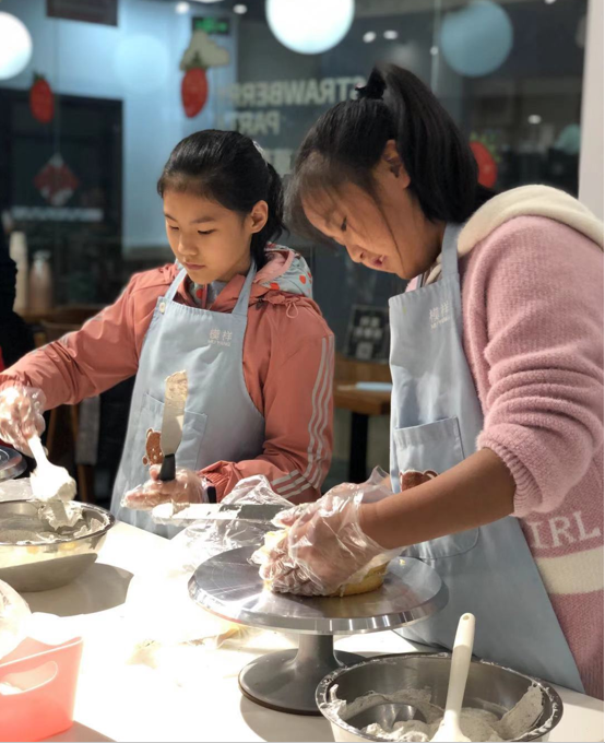 仟吉蛋糕店的工作人员做好了细致的准备,热情引领大家进入制作空间,麻利地投入准备工作之中。一声令下,小朋友们领取、佩戴围裙,洗手、涂抹油剂。接下来便是正式的制作环节。打发奶油、摊铺糕片、涂抹奶油、洒放布丁水果、修胚、挤花、打包,在工作人员的示范和家长们的协助下,宝贝们一步一步认真操作。当工作人员看到有位宝贝定型的蛋糕还不完美,提出帮她修型时,她说:“没关系,这才是我自己做的嘛!”说得没错,宝贝们有自己的想法,或许身为家长应该更多地聆听。在制作蛋糕的过程中,宝贝们还收获了珍贵的友谊。大家平时奔波在学校、培训班之间,亲密的小伙伴儿们也难得像这样轻松地聚在一起聊天、玩耍。