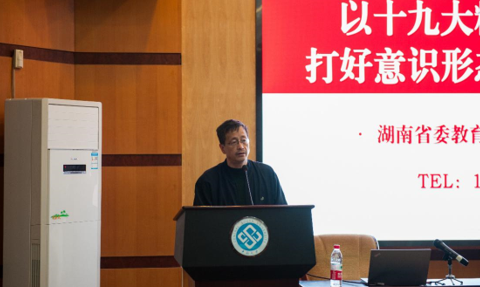刘国华教授主要从“千奇百怪怎么看?”、“斗争态势怎么判?”、“敌人正在怎么干?”、“我们应该怎么办?”四个方面结合历史与现实、国际与国内的形势,就如何贯彻落实十九大精神,打好意识形态领域的阵地战作了深刻而精彩的阐述。他从“意识形态领域错综复杂的种种表现”、“当前意识形态工作形势严峻、斗争激烈、态势明显向好”、“需要高度警惕的几种错误思潮评析”、“牢牢掌握领导权、管理权和话语权”等方面分析了当前意识形态领域的态势。刘教授以部分高校师生干部对意识形态的错误认识为例,结合党的十九大报告论述讲解了意识形态工作的重要性。他指出,在意识形态领域中需要高度警惕七种错误思潮,即“历史虚无主义思潮”、“宪政民主主义思潮”、“普世价值主义思潮”、“民主社会主义思潮”、“西方自由主义思潮”、“文化保守主义思潮”、“质疑否定改革开放思潮”。他强调,意识形态工作是关乎旗帜、关乎道路、关乎国家政治安全的重大工作。