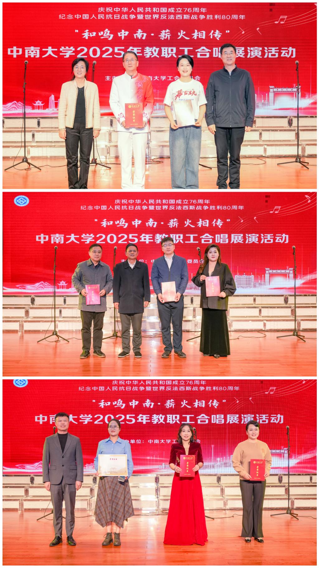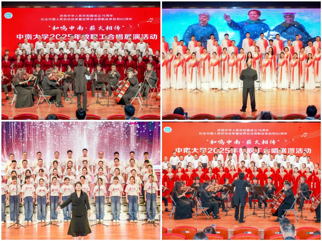 为庆祝中华人民共和国成立76周年,纪念中国人民抗日战争暨世界反法西斯战争胜利80周年,10月25日晚19:30,由中南大学工会主办的“和鸣中南,薪火相传”中南大学2025年教职工合唱展演活动在潇湘校区毓秀楼和声堂举行。毓秀楼和声堂气氛热烈,来自14个单位的近700名参展演员共同展示中南教职工的风采。湖南省教育工会邓曼副主席,校党委副书记、校工会主席付刚华出席活动。