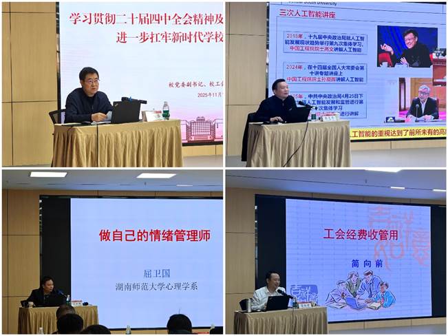 中南大学二级教授、博士生导师郭克华作“人工智能发展与大模型应用”专题报告,深入浅出地讲解了人工智能技术前沿发展及其对社会各领域的影响;湖南师范大学博士生导师、心理学系主任屈卫国教授以“做自己的情绪管理师”为题,生动阐述了压力管理与心理调适的有效方法;湖南省总工会经审办主任简向前围绕“管好用好工会经费,提升职工获得感幸福感安全感”主题,系统讲解了工会经费使用管理的政策规范和实践要点,有效帮助提升工会经费服务效能。