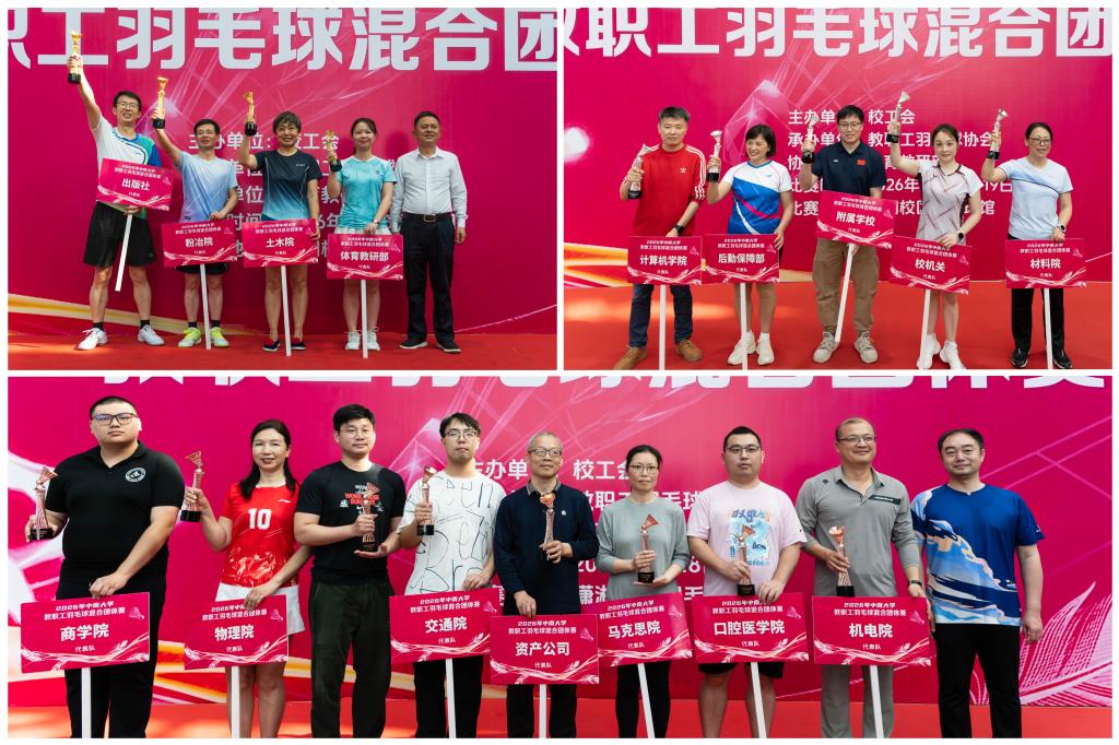经过激烈角逐,体育教研部、出版社、土木工程学院、粉末冶金研究院获本次教职工羽毛球混合团体赛一等奖,校机关、后勤保障部、附属学校、计算机学院、材料科学与工程学院获二等奖。商学院、湘雅口腔医(学)院、物理学院、机电工程学院、交通运输工程学院、冶金与环境学院、资产经营有限公司和马克思主义学院获三等奖。